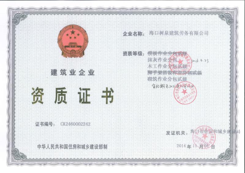海口樹泉建筑勞務有限公司成立于2011年,公司位于海口,其前身是一家專業建筑施工隊,自2004年即開始在海南從事建筑勞務施工。自成立至今,公司已經擁有一支科學管理、質量過硬、能打硬仗,搶工期的專業隊伍。能獨立承擔大中型工業與民用建筑 、室內外裝修、各類機電設備安裝工程。代表工程有??跒I海華庭、三亞時代海岸T01/02/04/05棟高層、合肥東?;▓@二期、陵水富力灣B區高層、三亞金中海(酒店)、瓊海大印經典花園、??诃h球海景大酒店(四星級酒店,在建中)、陵水珍珠大廈(五星酒店)、??谌f達廣場、美蘭機場二期。